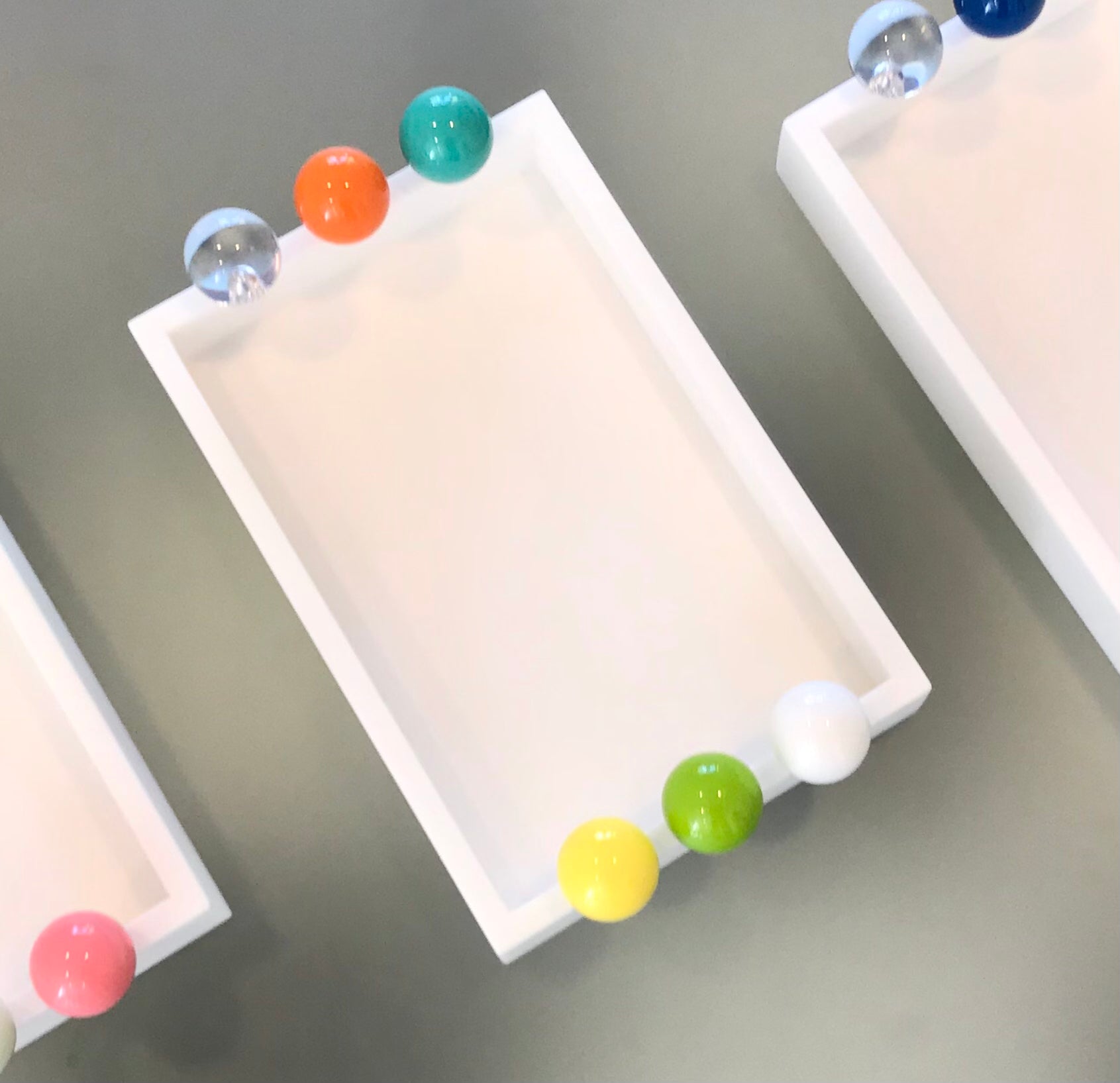 Everyone loves this fabulous design! Display this piece in your entry hall, on your coffee table, on a bedside table, or fill with a delicious appetizer for your next party. Shown here: white tray with bright multicolor knobs.
