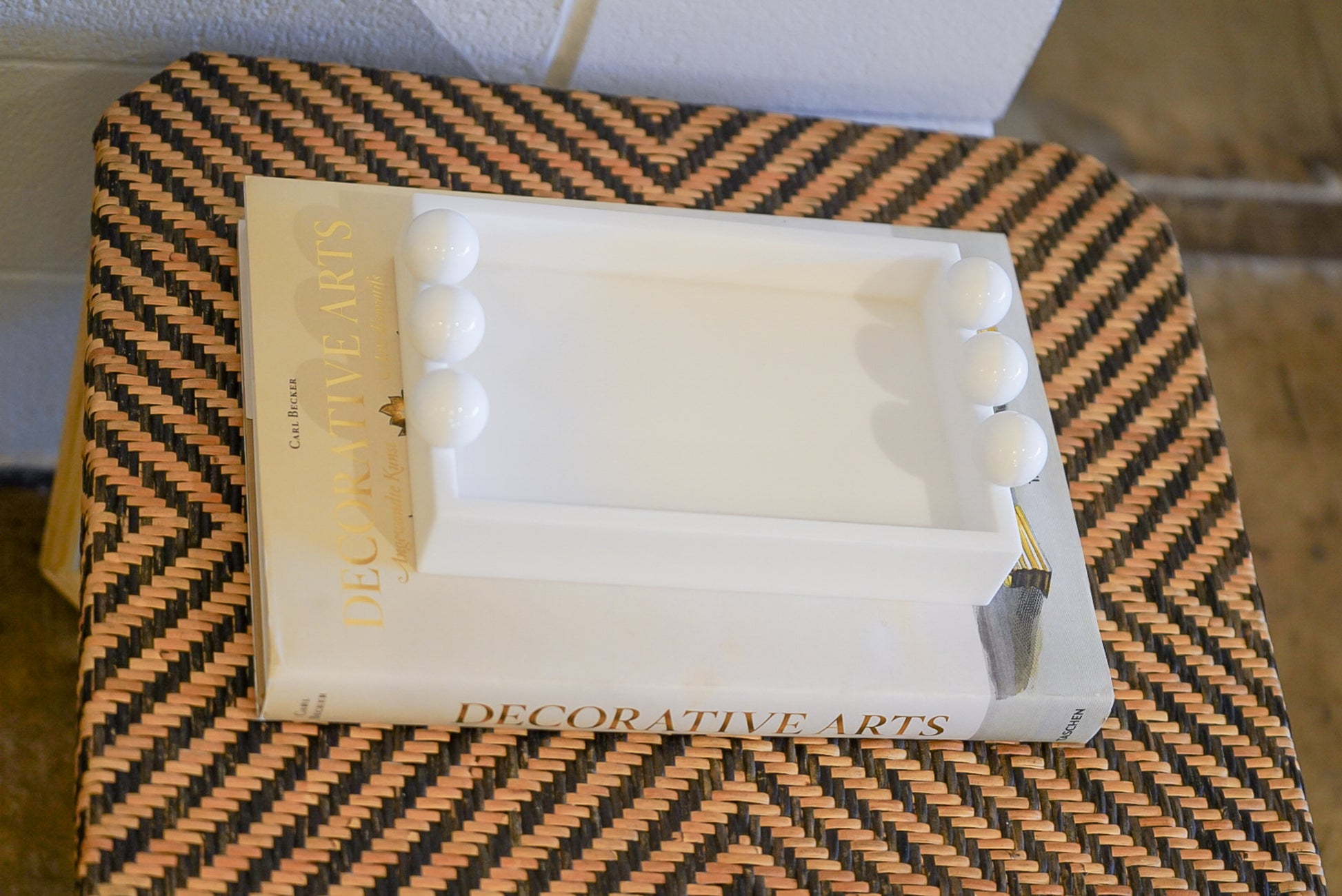 Obsessed yet?! Everyone loves this fabulous design! Display this piece in your entry hall, on your coffee table, on a bedside table, or fill with a delicious appetizer for your next party. Shown here: white tray with white knobs.