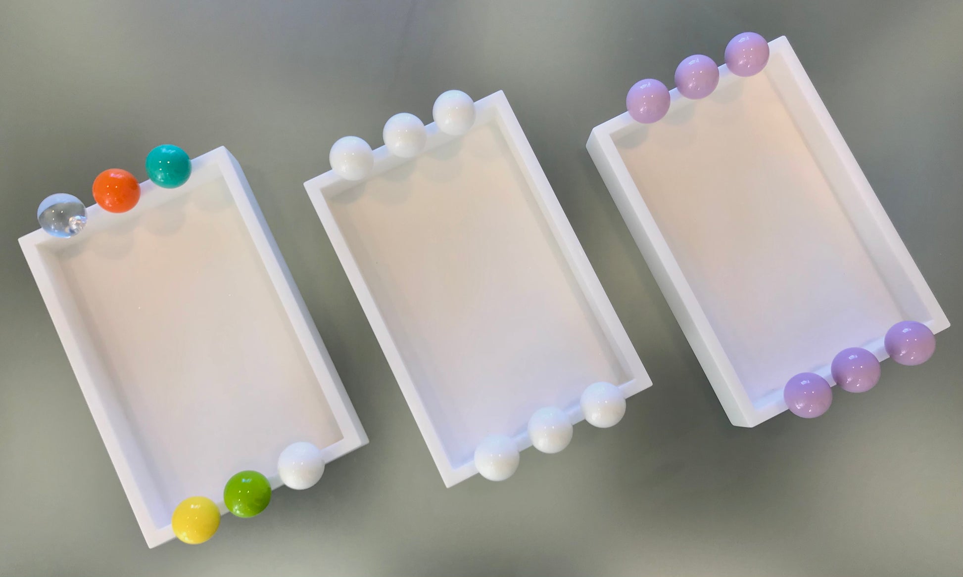 Obsessed yet?! Everyone loves this fabulous design! Display this piece in your entry hall, on your coffee table, on a bedside table, or fill with a delicious appetizer for your next party. Shown here: white tray with lavender knobs.